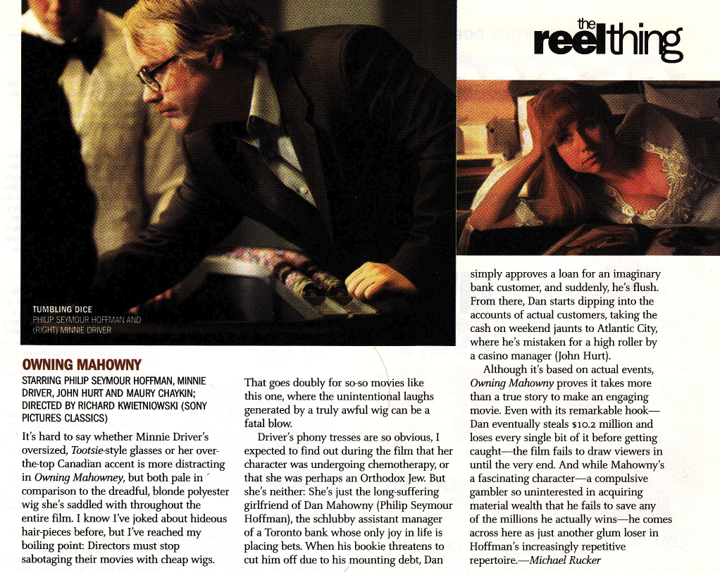 Driver’s phony tresses are so obvious, I expected to find out during the film that her character was undergoing chemotherapy, or that she was perhaps an Orthodox Jew. But she’s neither. She’s just the long-suffering girlfriend of Dan Mahowny (Philip Seymour Hoffman), the schlubby assistant manager of a Toronto bank whose only joy in life is placing bets. When his bookie threatens to cut him off due to his mounting debt, Dan simply approves a loan for an imaginary bank customer, and suddenly, he’s flush. From there, Dan starts dipping into the accounts of actual customers, taking the cash on weekend jaunts to Atlantic City, where he’s mistaken for a high roller by a casino manager (John Hurt).