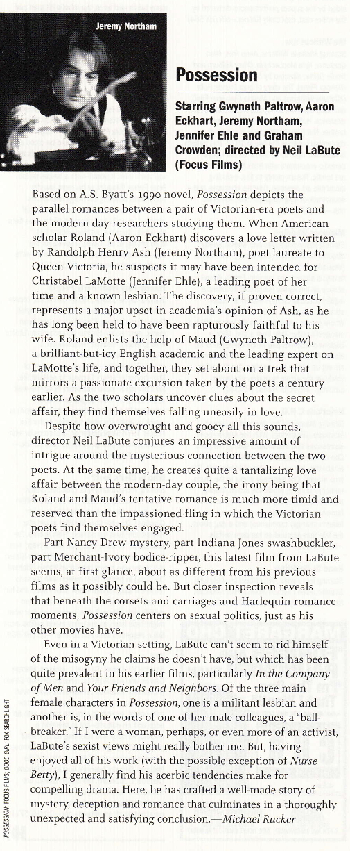 “Part Nancy Drew mystery, part Indiana Jones swashbuckler, part Merchant-Ivory bodice ripper, this latest film from LaBute seems, at first glance, about as different from his previous films as it possibly could be. But closer inspection reveals that beneath the corsets and carriages and Harlequin romances, Possession centers around sexual politics, just as his other movies have…”