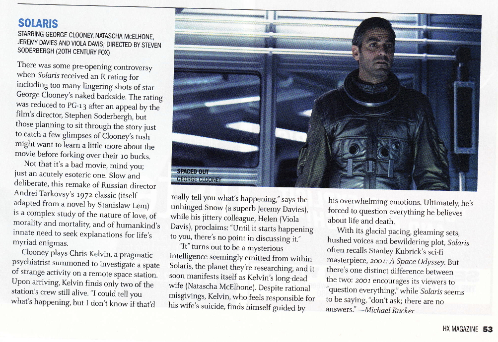 Solaris generated some pre-opening controversy when it received an R rating for including too many lingering shots of star George Clooney’s naked backside. The rating was reduced to PG-13 after an appeal by the film’s director, Stephen Soderbergh, but anyone planning to see it just to catch a few glimpses of Clooney’s tush might want to learn a little more about the movie before forking over their ten bucks.