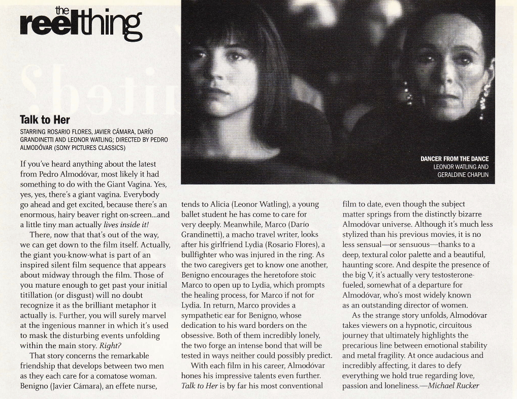 With each film in his career, Almodovar hones his already impressive talents even further. Talk to Her is by far his most conventional film to date, even though the subject matter springs from the distinctly bizarre Almodovar universe. Although it’s much less stylized than his previous movies, it is no less sensual – or sensorial – thanks to a deep, textural color palette and a beautiful, haunting score. And despite the presence of the giant you-know-what, it’s actually very testosterone-fueled, somewhat of a departure for Almodovar, who’s most widely known as an outstanding director of women.