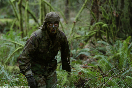 Friedkin also cribs from The Fugitive by casting Tommy Lee Jones as L.T. Bonham, the conflicted loner who, in his younger years, trained Aaron and countless others to be killing machines for the American armed forces. The Tommy Lee-in-relentless-pursuit gimmick worked to perfection in The Fugitive, but was already tired by the time it was put to use in U.S. Marshals. Now, it’s almost laughable; with Jones pushing 60, it’s hard to swallow his quick recovery from the severe bruisings he suffers here, which include a spear through the leg, a tumble over a waterfall, several deep cuts to the hand, slashes across the chest and stomach, a nasty slice in the face, and a deep stab through the upper arm.
