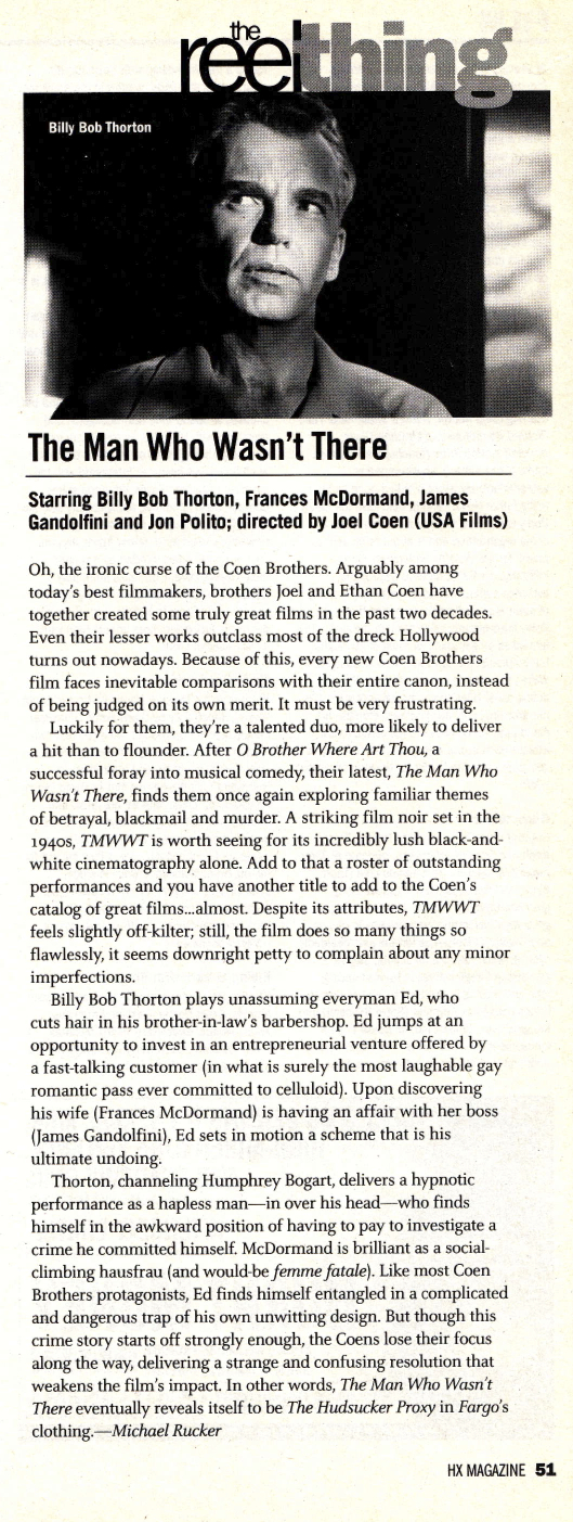 Luckily for them, they’re a talented duo, more likely to deliver a hit than to flounder. After a successful foray into musical comedy, their latest, The Man Who Wasn’t There, finds them once again exploring familiar themes of betrayal, blackmail and murder. A striking film noir set in the 1940’s, TMWWT is worth seeing for its incredibly lush black-and-white cinematography alone. Add to that a roster of outstanding performances and you have another title to add to the Coen’s catalog of great films…almost. Despite its attributes, TMWWT feels slightly off-kilter – slightly too bizarre, a tad too boring. Still, the film does so many things so flawlessly it seems downright petty to complain about any minor imperfections.