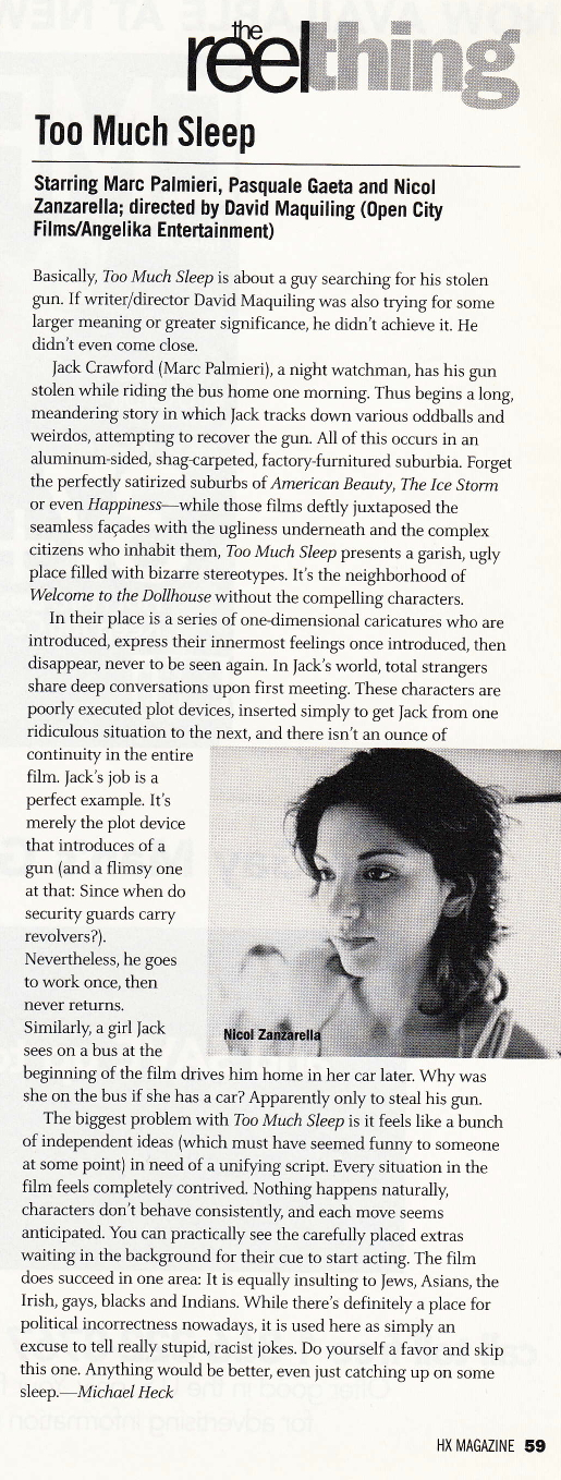 At its most basic level, Too Much Sleep is about a guy searching for his stolen gun. Presumably, writer/director David Maquiling was also trying for some larger meaning or greater significance. Regrettably, he didn’t achieve it. He didn’t even come close.