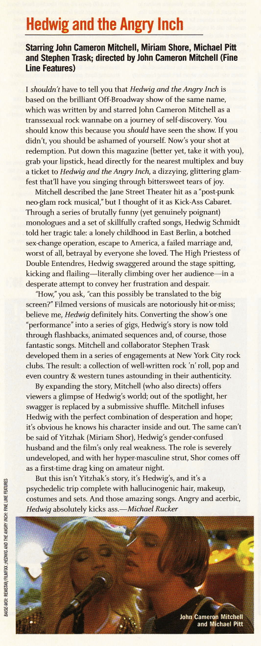 Now’s your shot at redemption. Put down this magazine (better yet, take it with you), grab your lipstick, head directly for the nearest multiplex and buy a ticket to Hedwig and the Angry Inch, a dizzying, glittering glam-fest that’ll have you singing through bittersweet tears of joy.