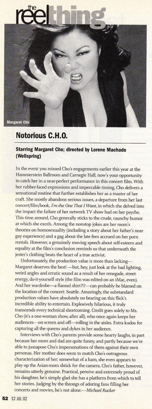 If you’ve ever bought one of the bootleg videos or DVDs sold on every corner in New York City – and admit it, you have – then you already have a pretty accurate idea of the production values you’ll find in Margaret Cho’s new concert film, Notorious C.H.O. Bad lighting, weird angles, erratic sound – Margaret would probably have done better by letting a few of the countless queens in her audience film the show from their seats with hand-held cameras (and while she was at it, she should probably have let them take a stab at her set and costume design, neither of which are very noteworthy). Amazingly, the substandard production values have absolutely no bearing on this flick’s incredible ability to entertain. Explosively hilarious, it truly transcends every technical shortcoming. Credit goes solely to Ms. Cho (it’s a one-woman show, after all), who once again keeps her audiences – on-screen and off – rolling in the aisles.