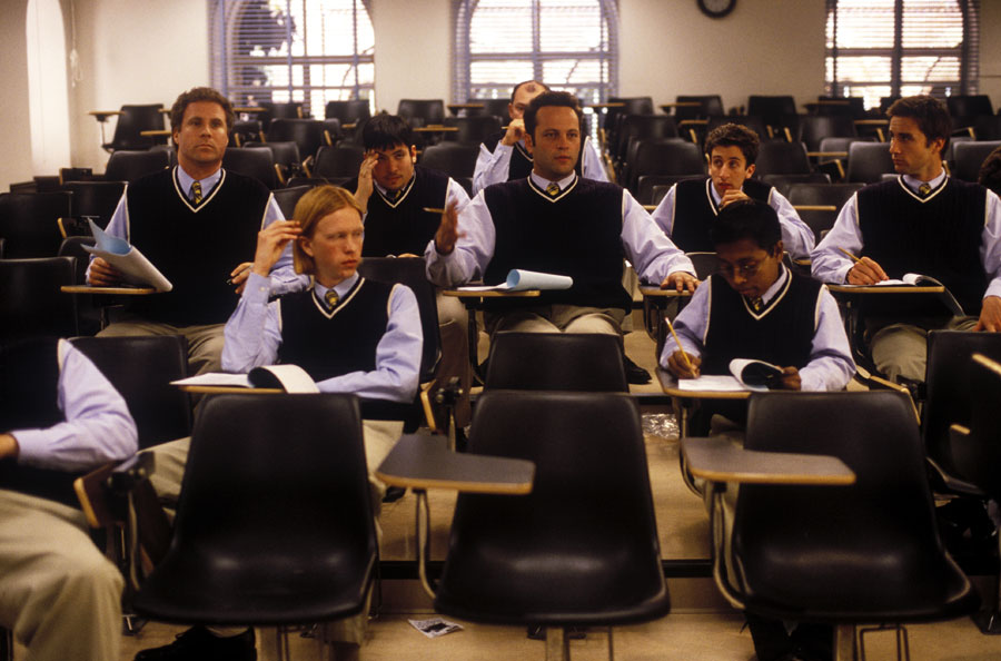 The paper-thin plot serves only to set the juvenile hijinks in motion. Upon discovering his girlfriend’s a cheating nymphomaniac, Mitch (Wilson) moves into a house near his old college campus. Before he can even unpack, his best buds Beanie (Vaughn) and Frank (Ferrell) commandeer the place and turn it into Party Central. Threatened with eviction by the university, the guys organize a fraternity of geeks and losers in order to take advantage of a legal loophole that allows them to stay if they provide student housing.