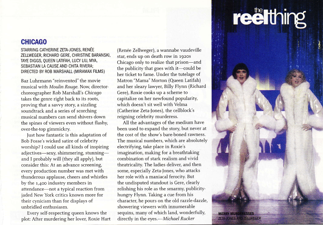 Baz Luhrmann “reinvented” the movie musical with his deliriously over-the-top Moulin Rouge. Now, director-choreographer Rob Marshall’s Chicago takes the genre right back to its roots, proving that a savvy story, a sizzling score and a series of scorching musical numbers can send shivers down the spines of viewers even without flashy cinematic gimmickry.