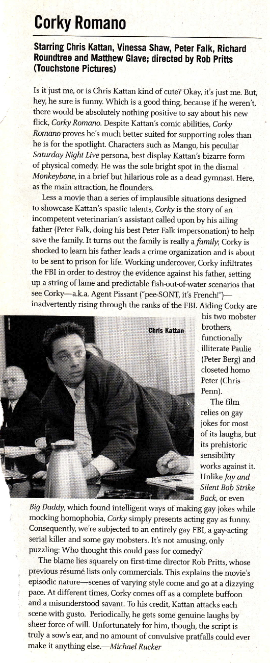 Is it just me, or is Chris Kattan kind of cute? Okay, it’s just me. Okay, he’s not really cute… at all. But, hey, he sure is funny. Which is a good thing, because if he weren’t, there would be absolutely nothing positive to say about his new flick, Corky Romano.