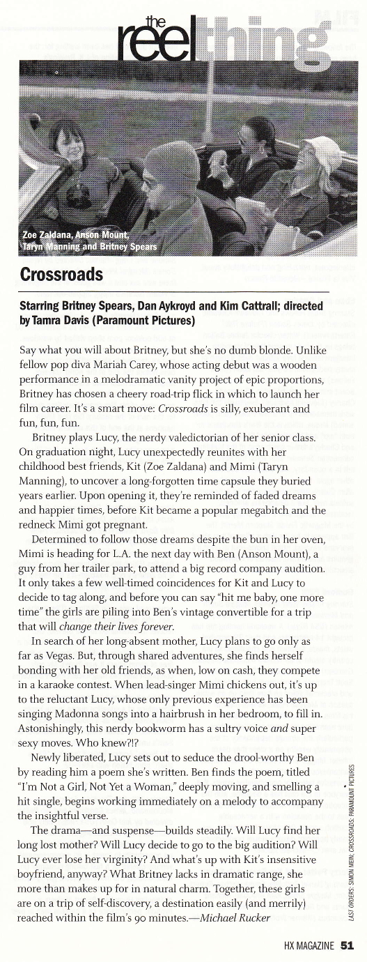 Say what you will about Britney, but she’s no dumb blonde. Unlike fellow pop diva Mariah Carey, whose acting debut was a wooden performance in a melodramatic vanity project of epic proportions, Britney has chosen a cheery road-trip flick in which to launch her film career. It’s a smart move; Crossroads is silly and exuberant and fun, fun, fun.