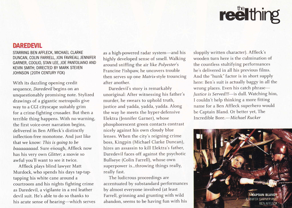 With its dazzling opening credit sequence, Daredevil begins on an unquestionably promising note. Stylized drawings of a gigantic metropolis give way to a CGI cityscape suitably grim for a crime-fighting crusader. But then, a terrible thing happens. With no warning, the first voiceover narration begins, delivered in Ben Affleck’s distinctly inflection-free monotone. And just like that we know: this is going to be baaaaaaaad. Sure enough, Affleck now has his very own Glitter; a movie so awful you’ll want to see it twice.