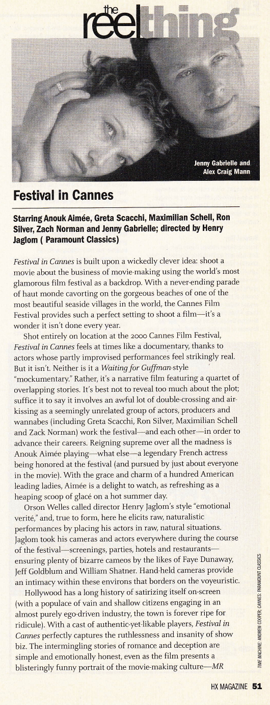 Shot entirely on location at the 2000 Cannes Film Festival, Festival in Cannes feels at times like a documentary, thanks to actors whose partly-improvised performances feel strikingly real. But it isn’t. Neither is it a Waiting for Guffman-style “mockumentary.” Rather, it’s a narrative film featuring a quartet of overlapping stories. It’s best not to reveal too much about the plot; suffice it to say it involves an awful lot of double-crossing and air-kissing as a seemingly unrelated group of actors, producers and wannabes (including Greta Scacchi, Ron Silver, Maximilian Schell and Zack Norman) work the festival – and each other – in order to advance their careers. Reigning supreme over all the madness is Anouk Aimée playing – what else – a legendary French actress being honored at the festival (and pursued by just about everyone in the movie). With the grace and charm of a hundred American leading ladies, Aimée is a delight to watch, as refreshing as a heaping scoop of glace on a hot summer day.