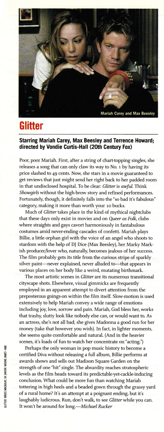 Much of Glitter takes place in the kind of mythical nightclubs that only exist in movies and on Queer as Folk; clubs where straights and gays cavort harmoniously in fantabulous costumes amid never-ending cascades of confetti. Mariah plays Billie, a little orphan girl with the voice of an angel who shoots to stardom with the help of DJ Dice (Max Beesley), her Marky Mark-ish producer/lover who, naturally, becomes jealous of her success. The film probably gets its title from the curious stripe of sparkly silver paint – never explained, never alluded to – that appears in various places on her body like a weird, mutating birthmark.