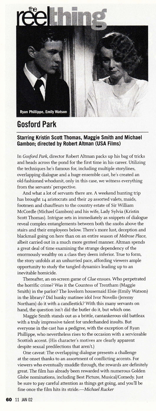 In Gosford Park, director Robert Altman packs up his bag of tricks and heads across the pond for the first time in his career. Utilizing the techniques he’s famous for, including multiple storylines, overlapping dialogue and a huge ensemble cast, he’s created an old-fashioned whodunit, only in this case, we witness everything from the servants’ perspective.