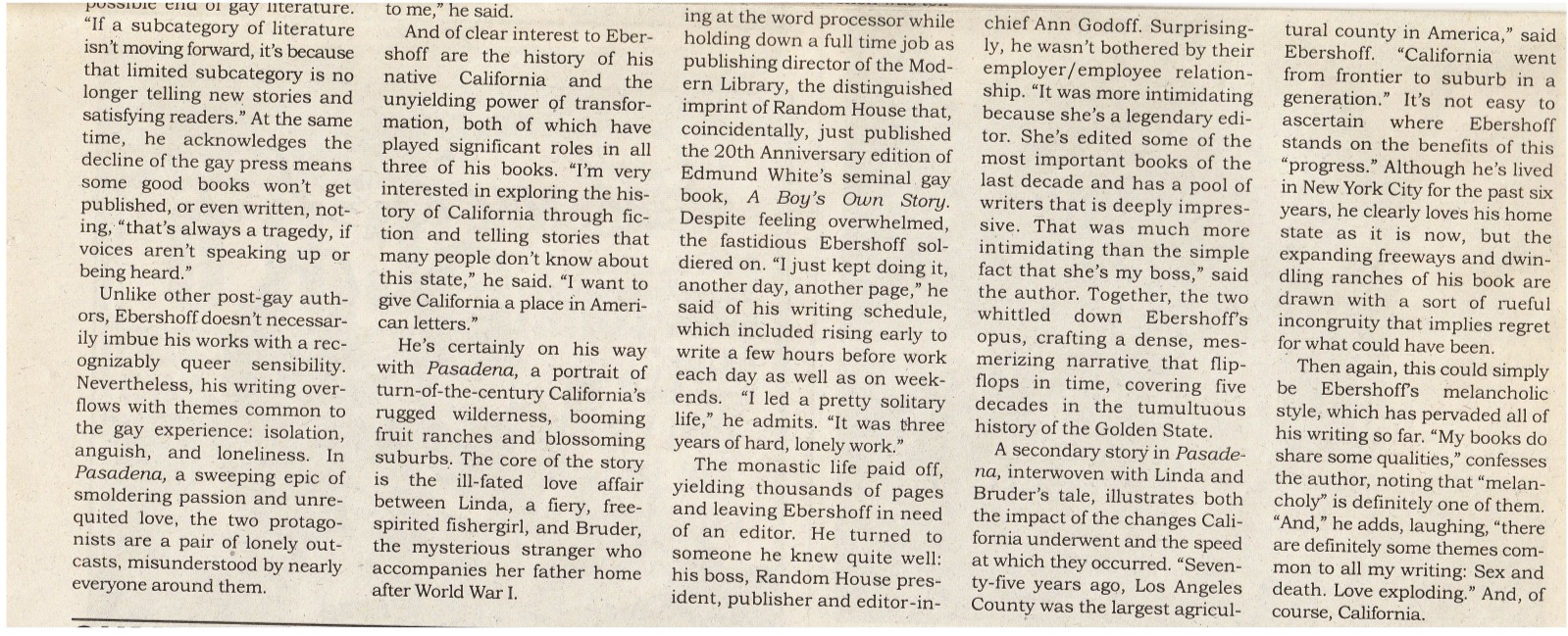 The death knell for gay literature, which has been ringing persistently for quite some time, just grew louder with Edmund White’s recent essay predicting the genre’s extinction as gay fiction becomes more commonly read by general audiences. As if on cue, gay writer David Ebershoff has suddenly emerged as one of the hottest authors around, transcending sexual, political and cultural labels. Building on the critical acclaim generated by his first two books, his new novel, Pasadena, has the publishing industry buzzing.